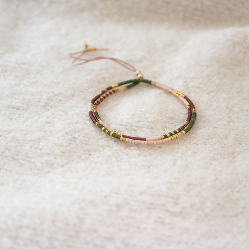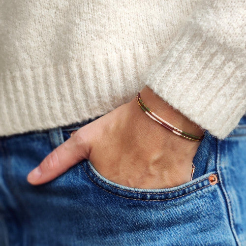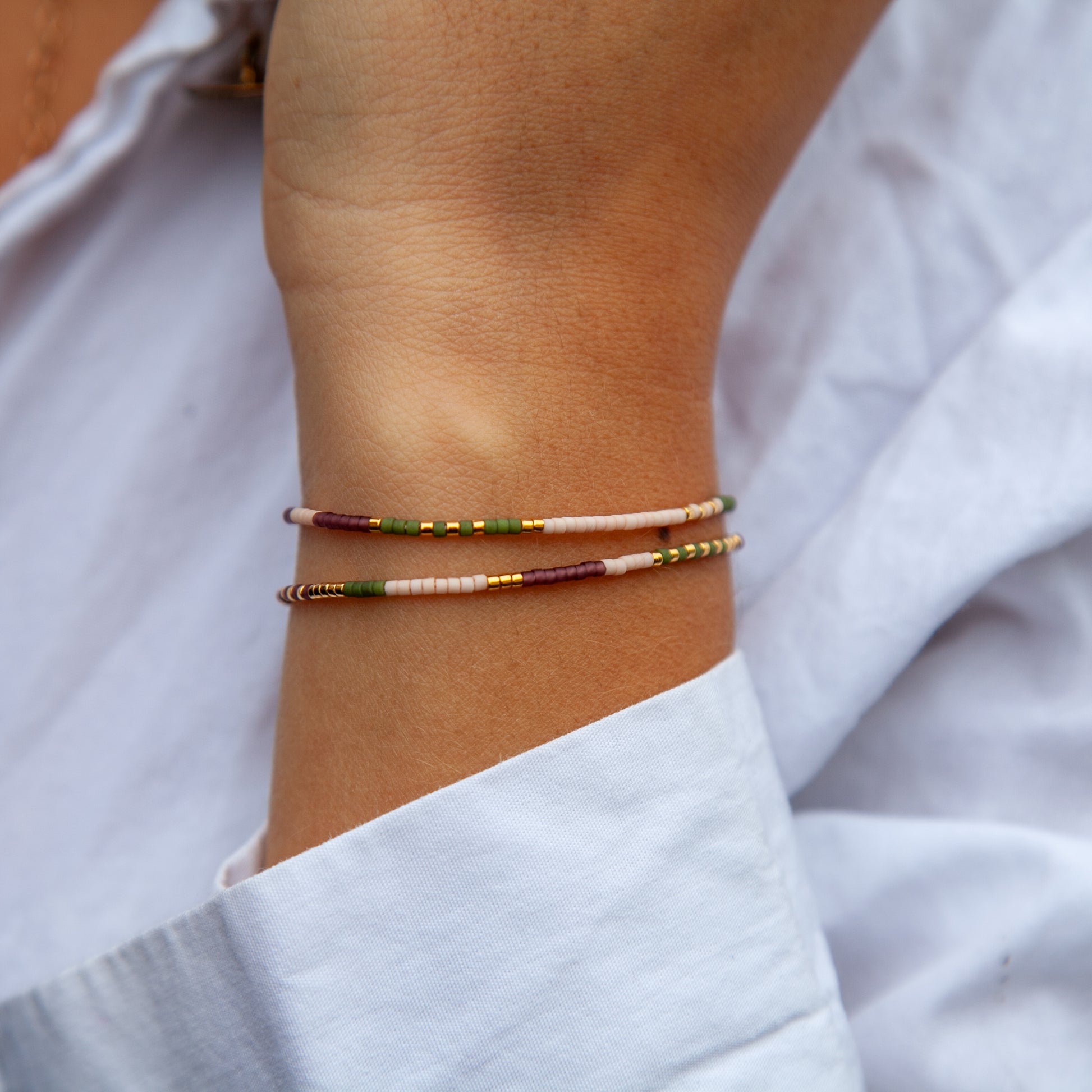 Dvojitý náramek ze skleněných korálků v barvě něžně růžové, starofialové, lahvově zelené, zlaté a z hedvábné šňůrky. Zlaté korálky jsou pozlacené 24 karátovým zlatem.