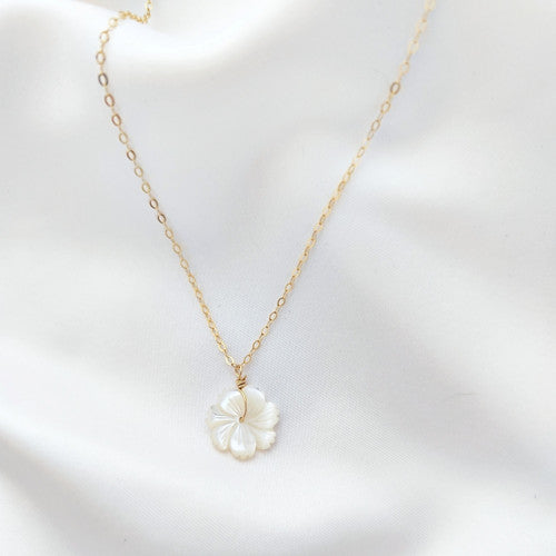Ručně vyřezávaný květ z perleti zavěšený na jemném řetízku. Něžný a romantický šperk.