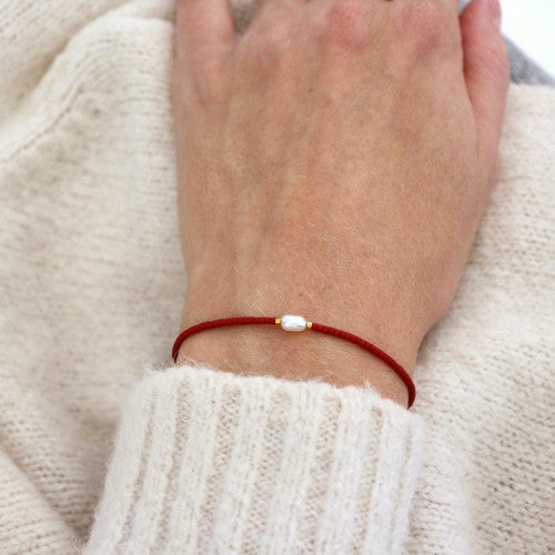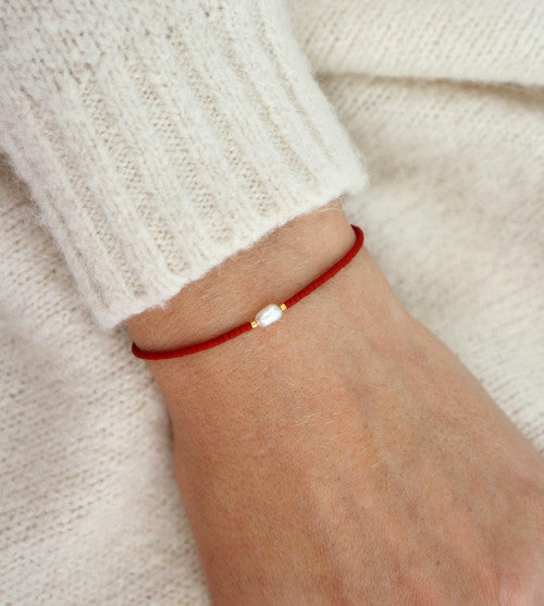 Náramek z malinkých červených korálků, dvou pozlacených 24 karátovým zlatem a malé sladkovodní perly na hedvábné šňůrce.