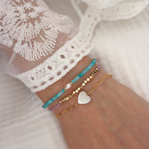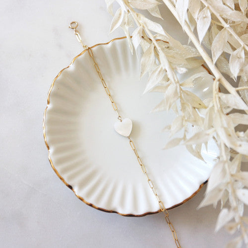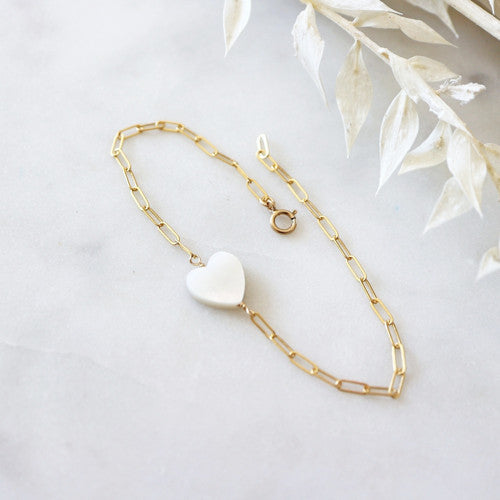 Náramek z řetízku tvořeného propojenými oválky s perleťovým srdíčkem. Náramek je potažen několika vrstvičkami 14 kt zlata (gold filled), díky tomu jej bez obav můžete nosit každý den.