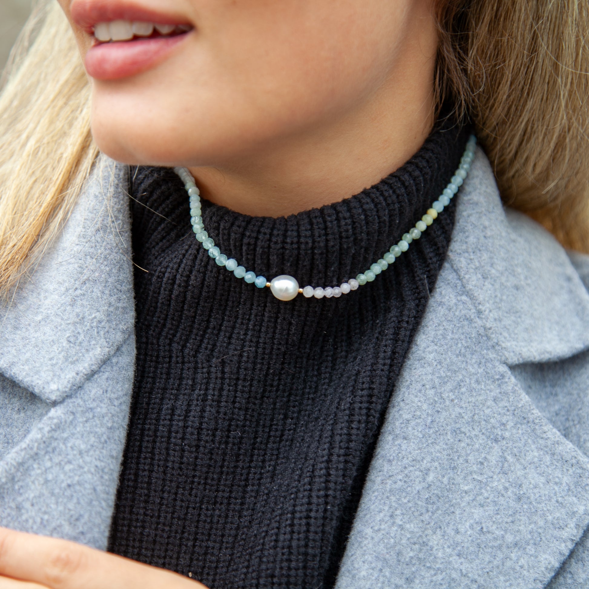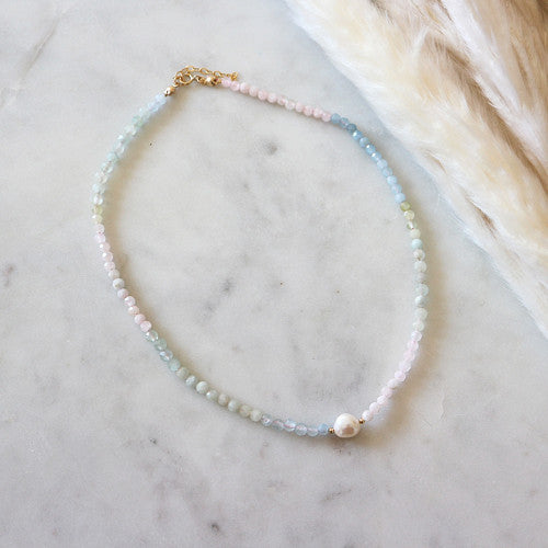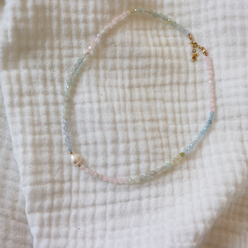 Něžný, minimalistický náhrdelník z broušených kuliček duhového morganitu se sladkovodní perlou uprostřed.