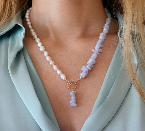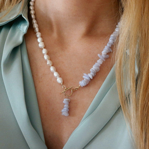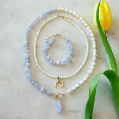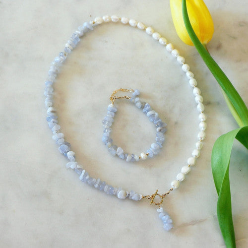 Náramek a náhrdelník ze sladkovodních perel a zlomků modrobílého krajkového achátu. Doplněny jsou zlatými komponenty.