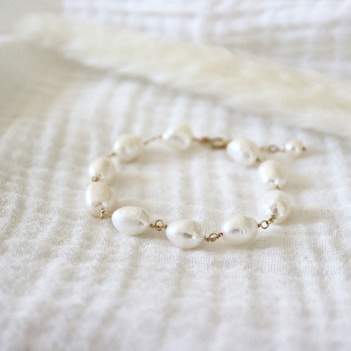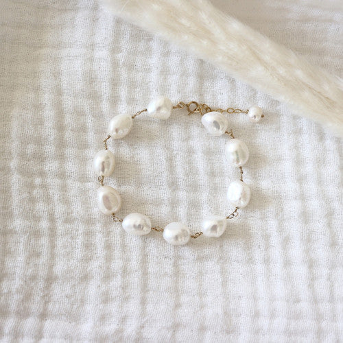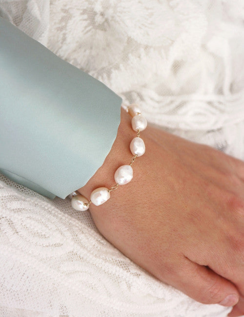 Náramek z větších sladkovodních "barokních" perel oválného, mírně nepravidelného tvaru. Konec řetízku je ozdoben malou perlou.