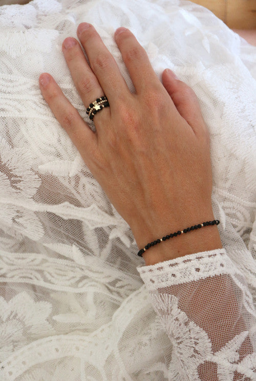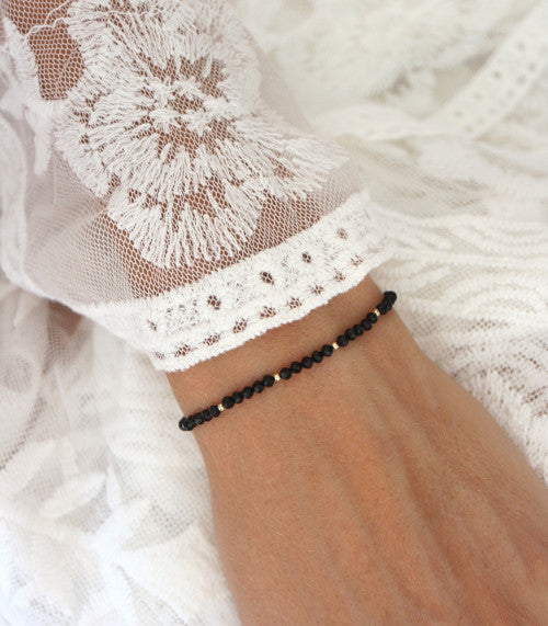 Náramek z těch nejmenších černých spinelů. Doplněny jsou zlatými 14 kt gold filled korálky. Spinely jsou broušené, díky tomu krásně odrážejí světlo a jemně se třpytí.
