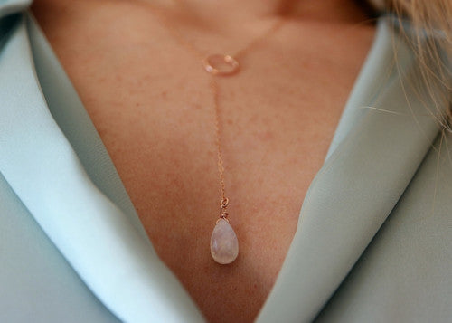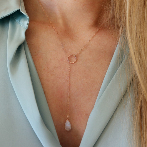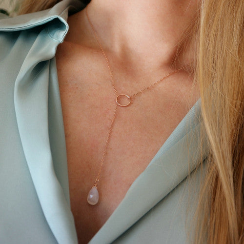 Dlouhý náhrdelník s kruhem a kapkou broušeného měsíčního kamene v provedení růžového zlata. Řetízek je bez zapínání, kapka se pouze provlékne kružkem. Jde o tzv. "blue fire" měsíční kámen s jemnými tyrkysovými odlesky.