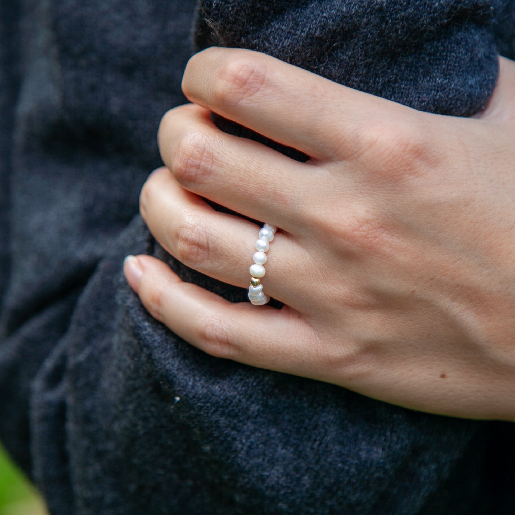 Něžný prstýnek z přírodních sladkovodních perel doplněných zlatým korálkem. Must have letní šperk!