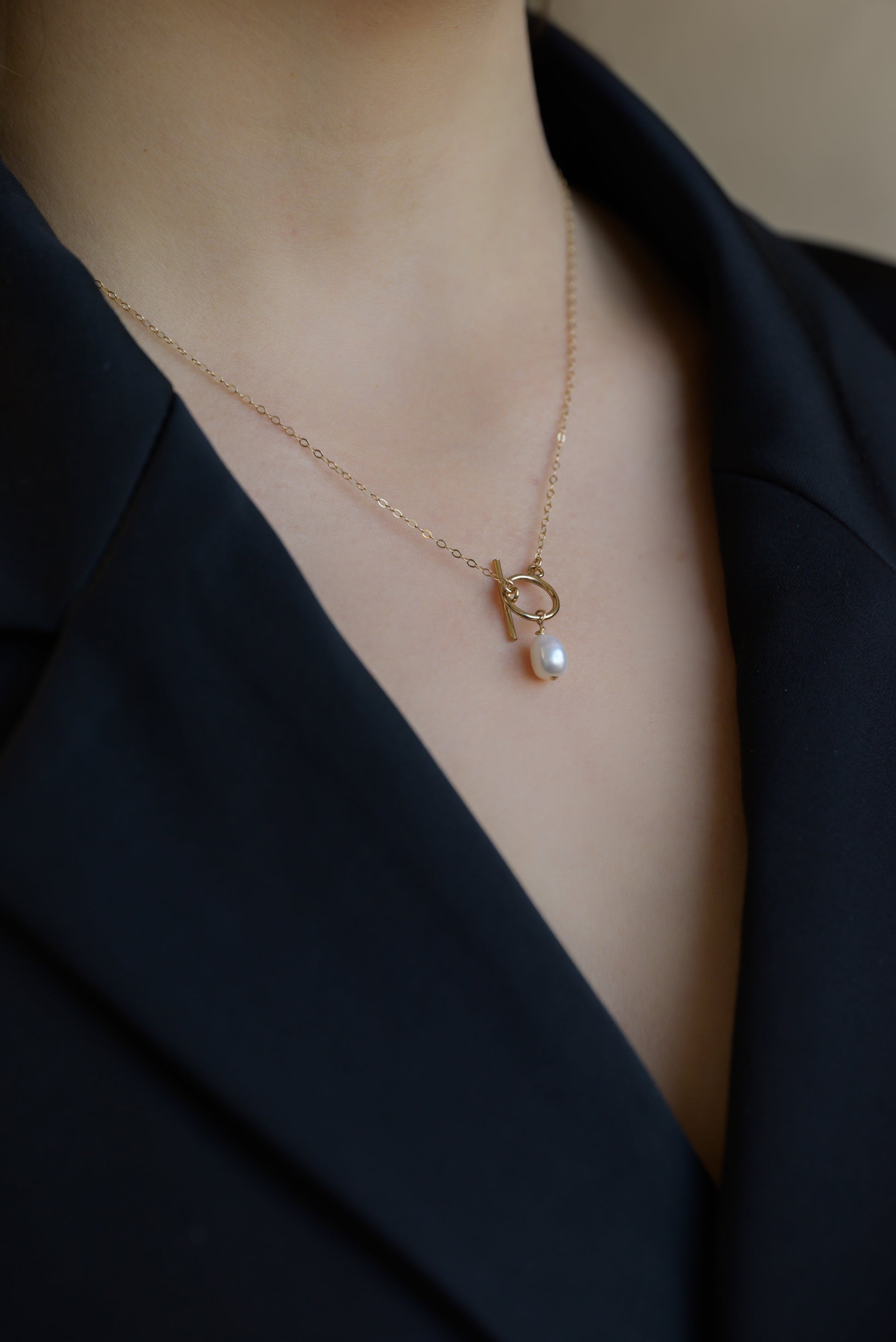Jemný řetízek se zajímavým zapínáním umístěným vepředu na krku a sladkovodní perlou. Nejkvalitnější zlacení "gold filled" (plněno zlatem), díky němuž je řetízek vhodný i na každodenní nošení.