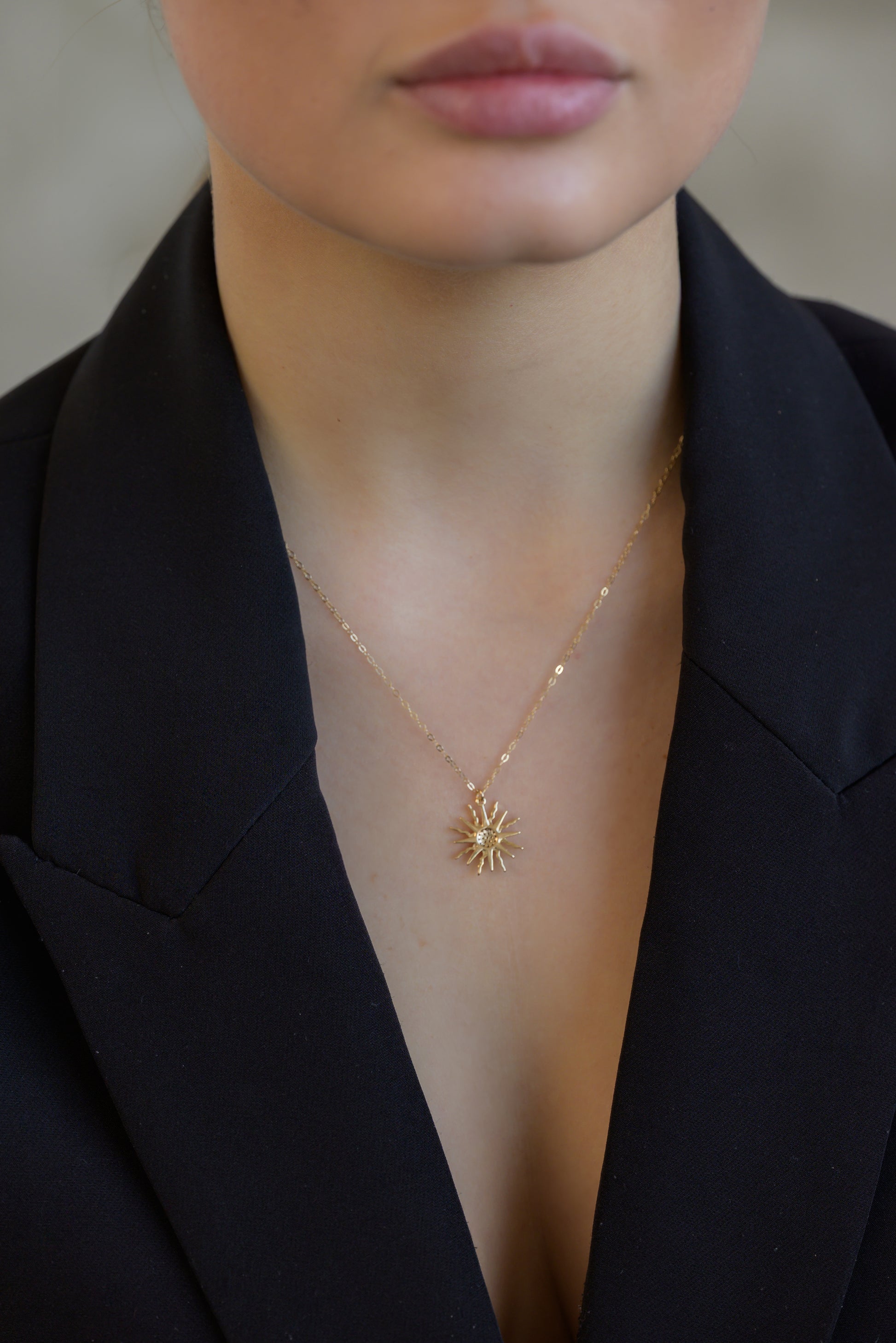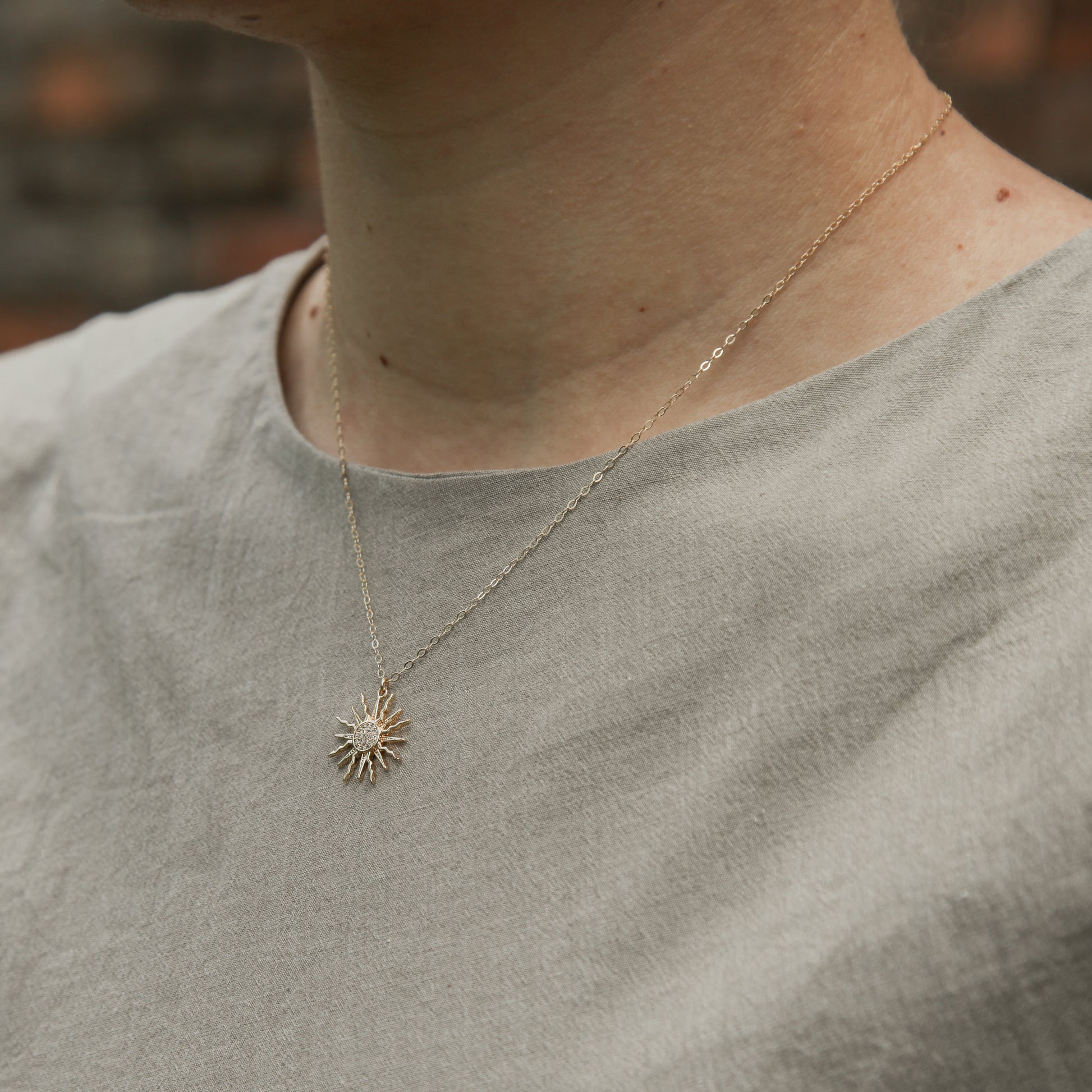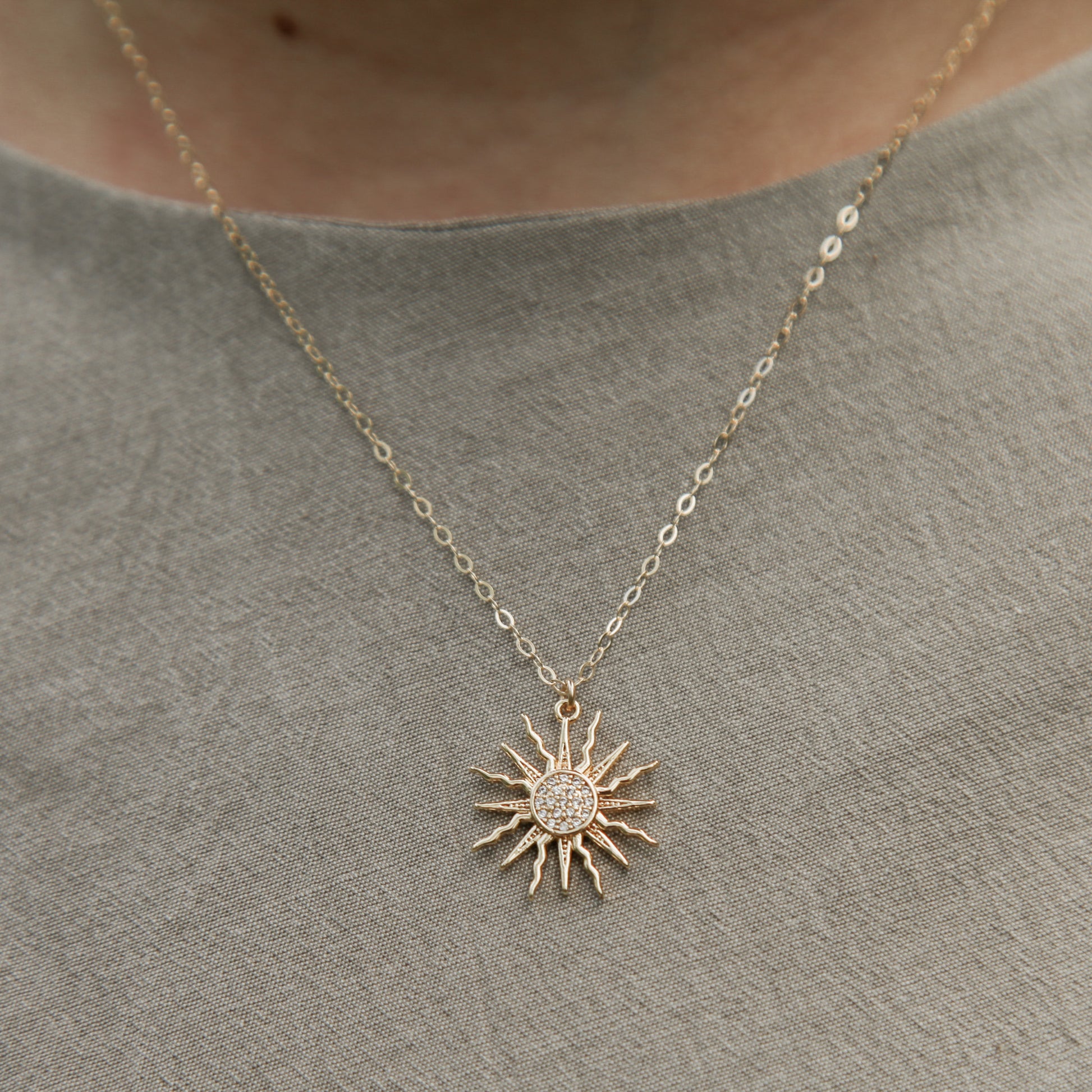 Řetízek se sluníčkem vykládaným zirkony. Jemný, minimalistický šperk. Řetízek je plněný 14 kt zlatem (gold filled).