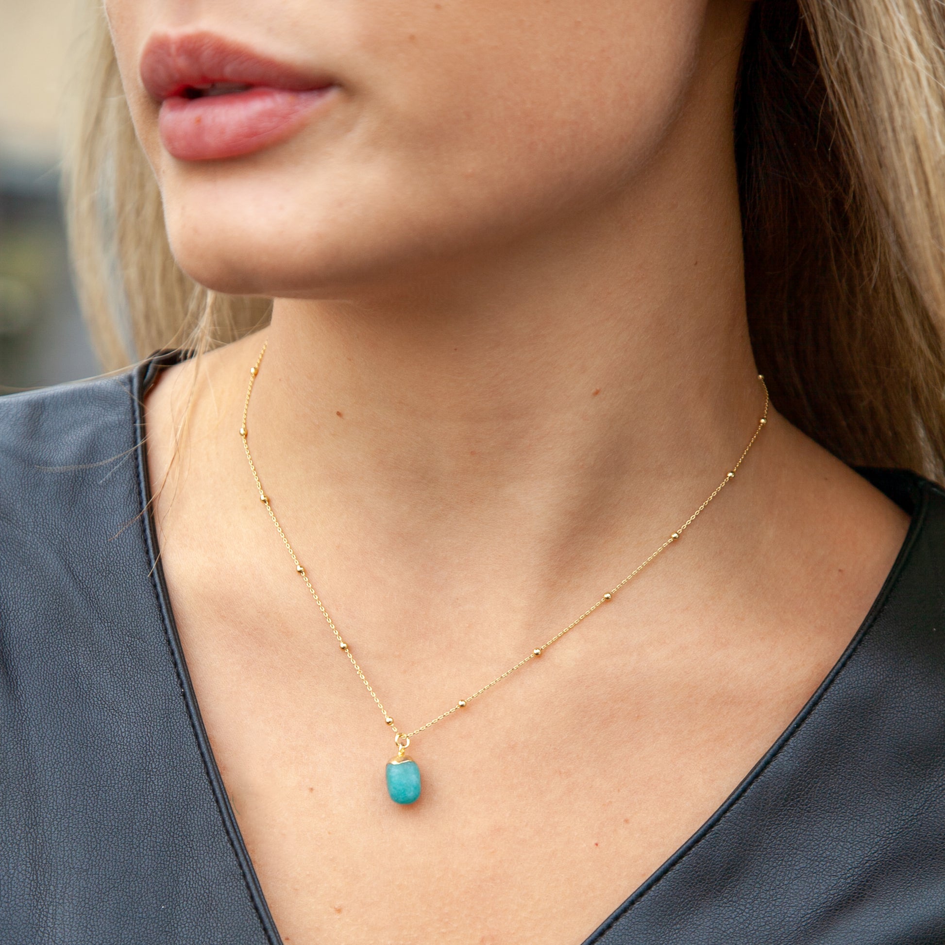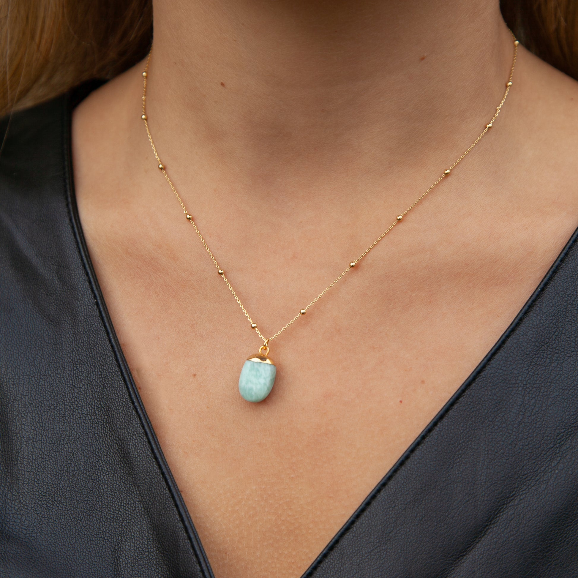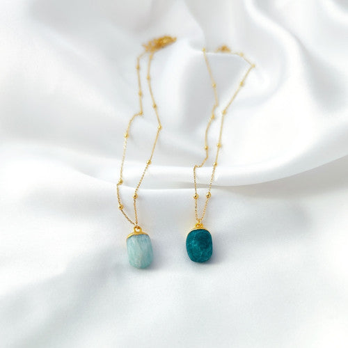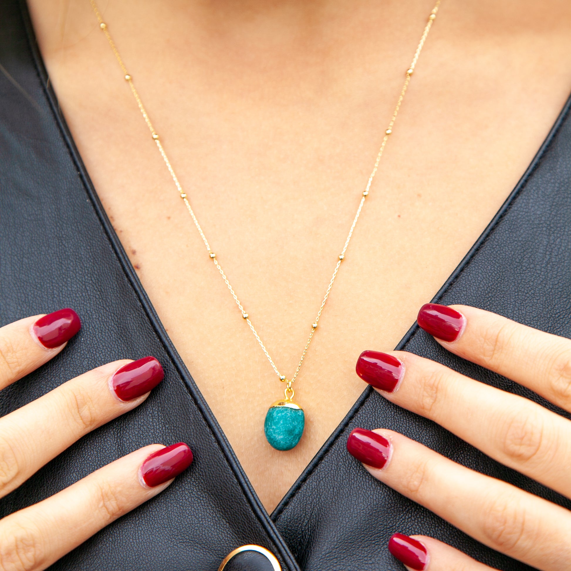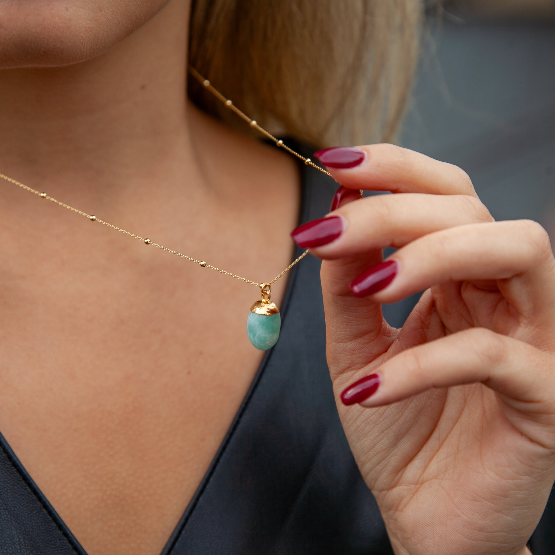 Pozlacené řetízky s kuličkami, na kterých jsou zavěšeny kameny laděné do zelených odstínů s matnou úpravou.