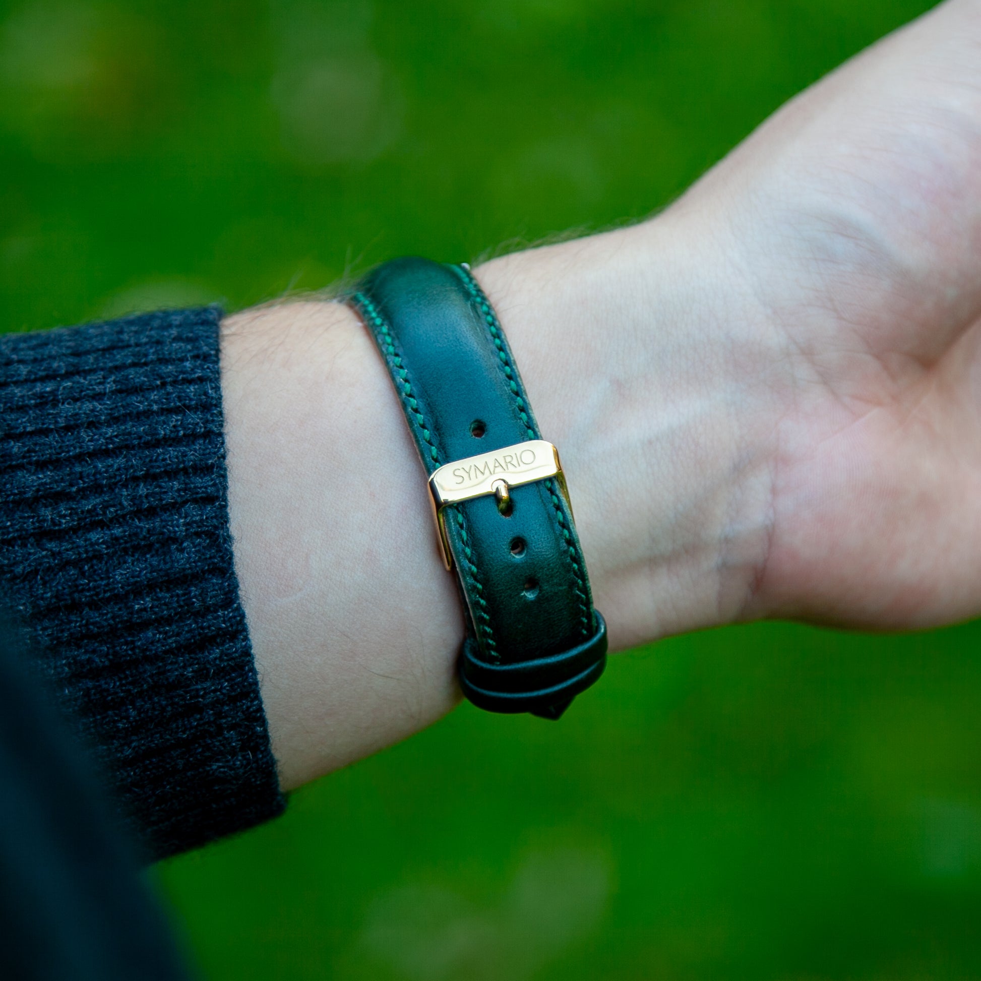 K výrobě hodinkových pásků se používá nejkvalitnější třísločiněnná kůže, která bude celý život pracovat a získávat bohatou patinu. Pásek má v některých místech až čtyři vrstvy usně a je celý ručně obšitý sedlářským stehem.