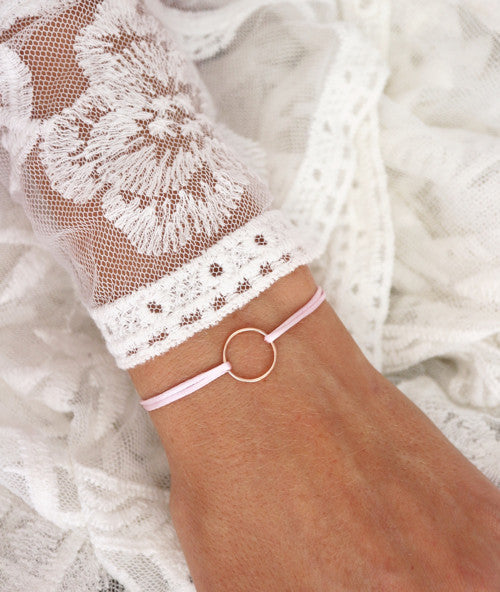 Náramek s kroužkem pozlaceným růžovým zlatem a světle růžovou saténovou šňůrkou.
