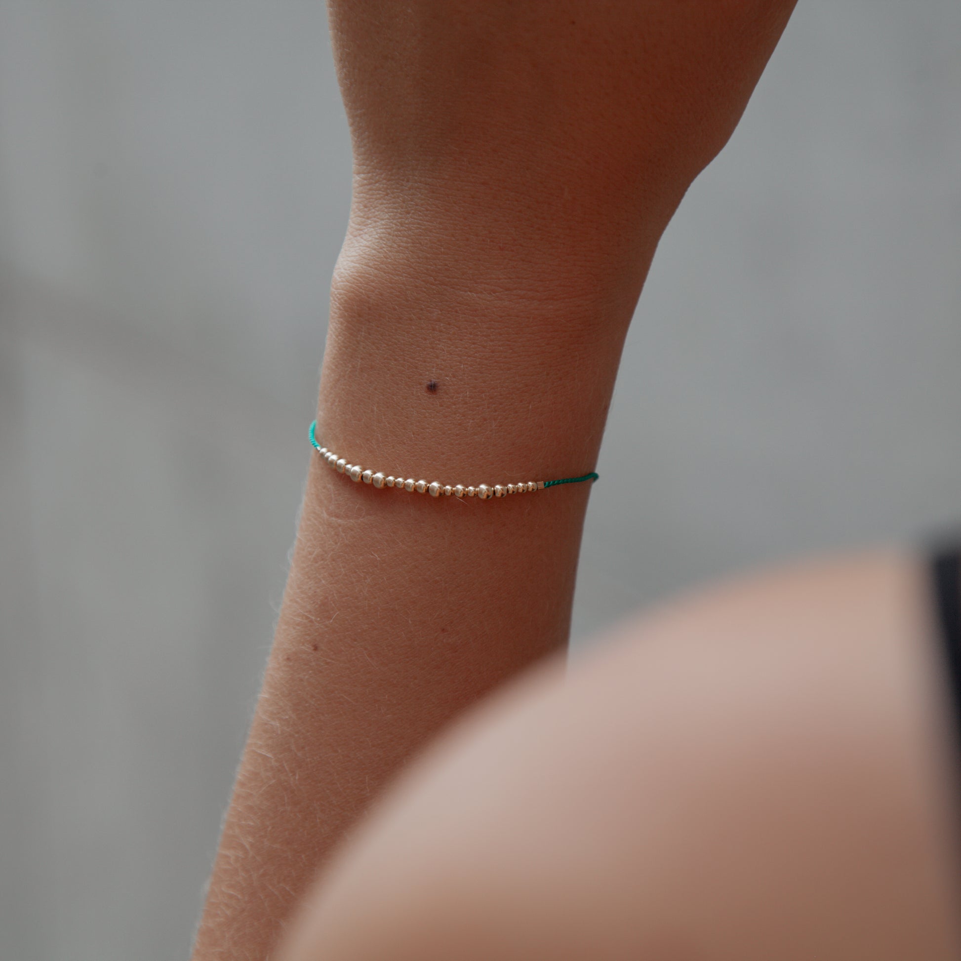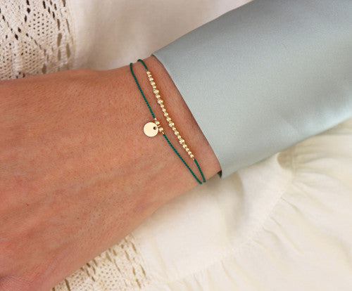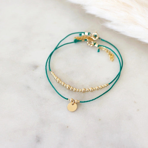 Dva minimalistické náramky ze smaragdově zelené hedvábné šňůrky s mincí a korálky.